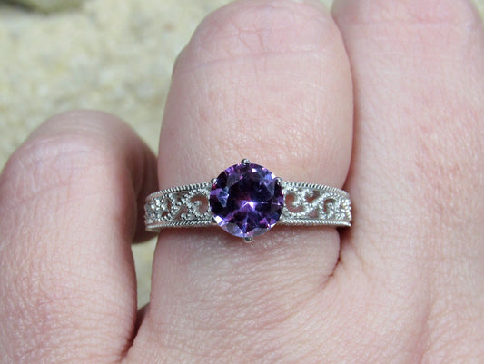 1ct Vintage Color Change Sapphire Engagement Ring Antique Filigree Round Polymnia Petite Custom White-Yellow-Rose Gold-10k-14k-18k-Plat 6mm