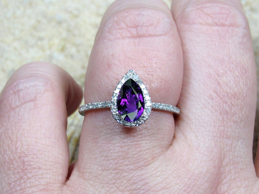 Alexandrite Sapphire & Diamonds Pear Halo Engagement Ring Helena 1ct 7x5mm Custom Size White-Yellow-Rose Gold-10k-14k-18k-Platinum