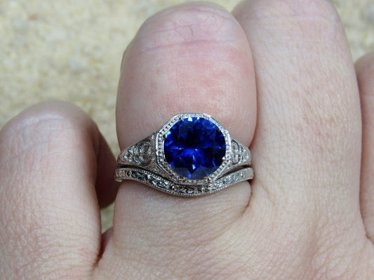 2ct Fides 8mm Blue Sapphire Engagement Ring Set, Vintage, Antique, Filigree, Wedding Band Set