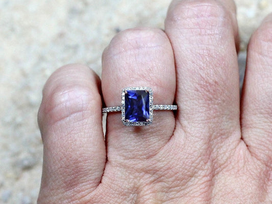 Blue Sapphire & Diamonds Emerald Halo Engagement Ring Wedding Band Set Ione Ferarelle 2ct 8x6mm White-Yellow-Rose Gold-10k-14k-18k-Platinum