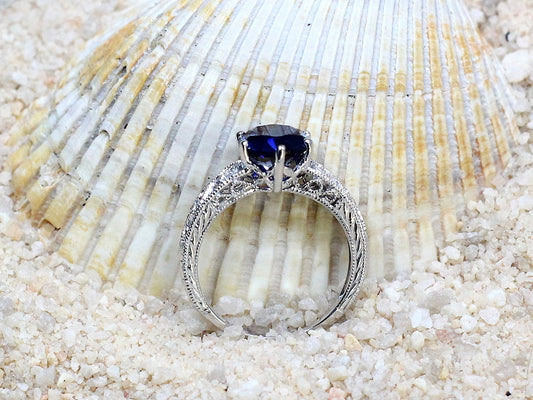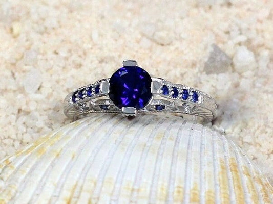 Vintage Blue Sapphire Engagement Ring Filigree 1ct 6mm Dionysus Custom Size White-Yellow-Rose Gold-10k-14k-18k-Platinum