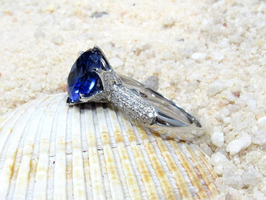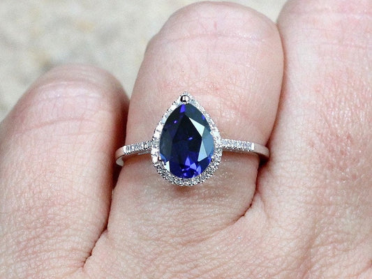 Blue Sapphire & Diamonds Engagement Ring Pear Halo drop Cut Goccia Grand 2.5ct 10x7mm Custom Siz White-Yellow-Rose Gold-10k-14k-18k-Platinum