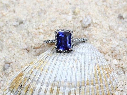 Blue Sapphire Engagement Ring, Emerald cut, Halo Ring, Ione, 2ct, 8x6mm