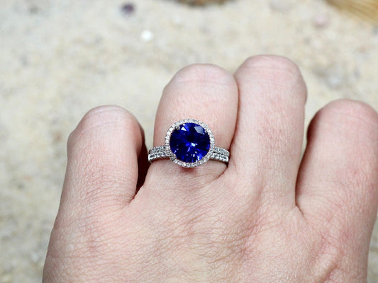 Blue Sapphire Engagement Ring Set,Wedding Band Set,Pricus,3ct 9mm Set,Blue Sapphire Ring Set,White-Yellow-Rose Gold-10k-14k-18k-Platinum
