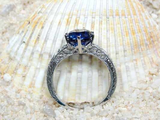 Vintage Blue Sapphire Engagement Ring Antique Style Filigree Oval Polymnia 3ct 9x7mm Custom White-Yellow-Rose Gold-10k-14k-18k-Platinum