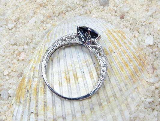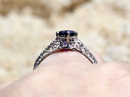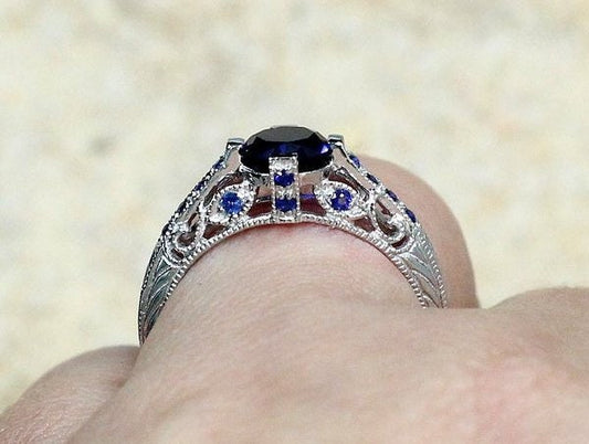 Vintage Blue Sapphire Engagement Ring Rhemba Antique Filigree 1ct 6mm Custom Size White-Yellow-Rose Gold-10k-14k-18k-Platinum