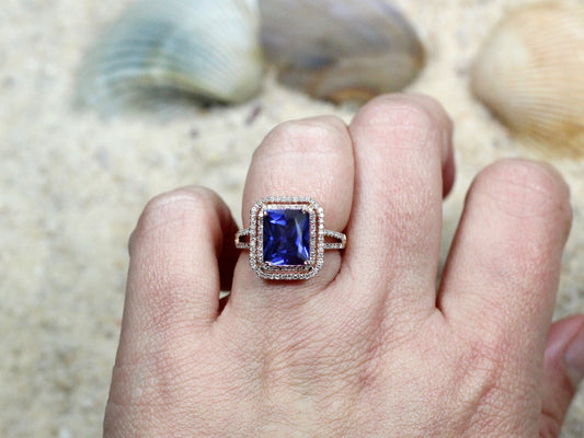 Blue Sapphire Engagement Ring, Double Halo, Radiant, Belus, 4ct, 10x8mm,Split Shank