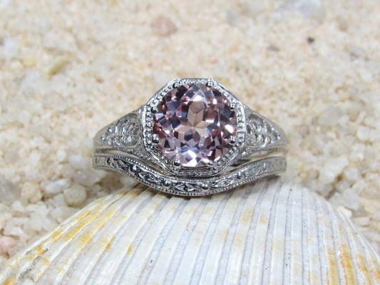 2ct Fides 8mm Peach Sapphire Engagement Ring Set, Vintage, Antique, Filigree, Wedding Band Set