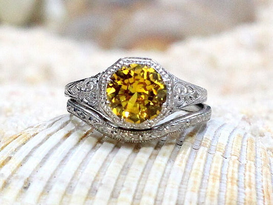 2ct Fides 8mm Yellow Sapphire Engagement Ring Set, Antique, Filigree, Vintage