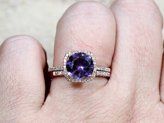 3ct Cuscino 8mm Color Change Sapphire & Diamonds Accent Cushion Halo Engagement Ring Set