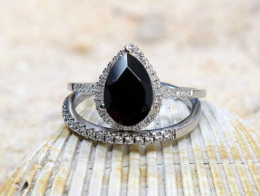 Black Spinel Engagement Ring Set,Diamond Pear Halo,Wedding Band Set,Goccia,2.5ct Ring,White-Yellow-Rose Gold-10k-14k-18k-Platinum
