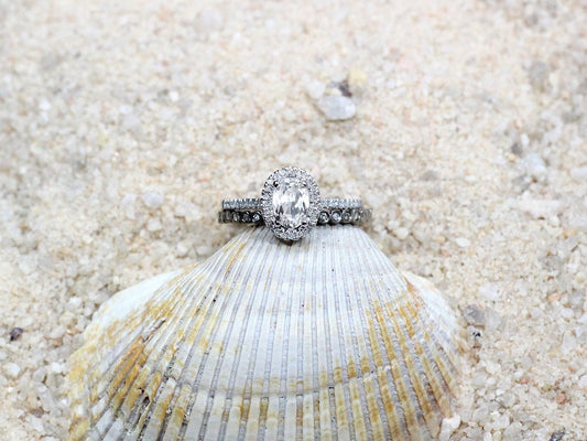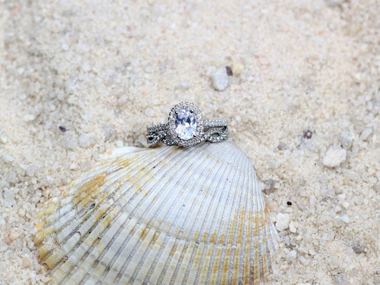 1ct Ovale 7x5mm Oval White Sapphire & Diamond Accent Halo Engagement Ring Set
