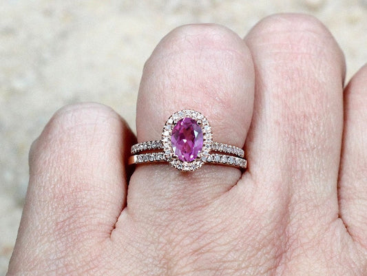 Pink Sapphire Engagement Ring Set, Oval Halo, wedding band Set, Ovale, 2ct, 8x6mm, Promise ring, gift for her