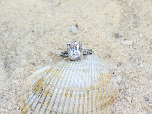White Sapphire & Diamonds Engagement Ring Halo Emerald Set Wedding Band Ione 2ct 8x6mm Custom White-Yellow-Rose Gold-10k-14k-18k-Platinum