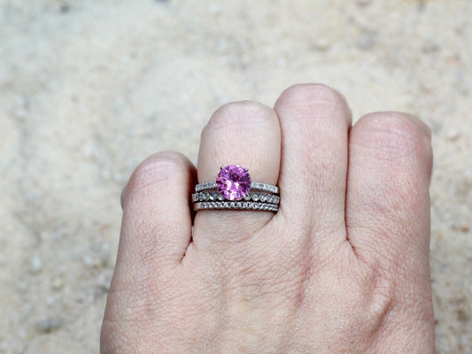 2ct Pistis Ferarelle 8mm Pink Sapphire Diamond Accent & Diamond Eternity Bezel Wedding Set Rings.