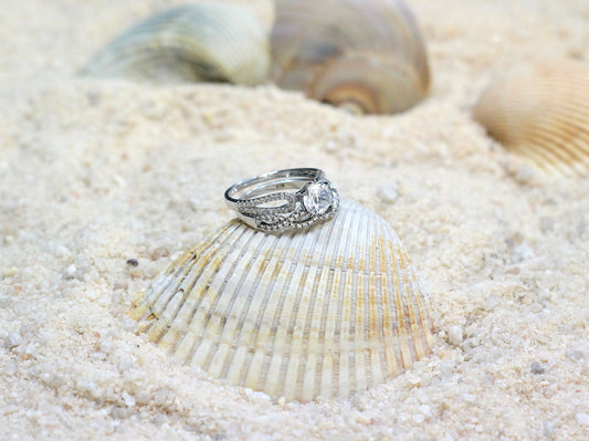 White Sapphire Engagement Ring Set,Milgrain Ring,Filigree Ring,Ione,Art Deco,2ct Ring,Vintage Ring,Wedding Band Set,Gold-Platinum