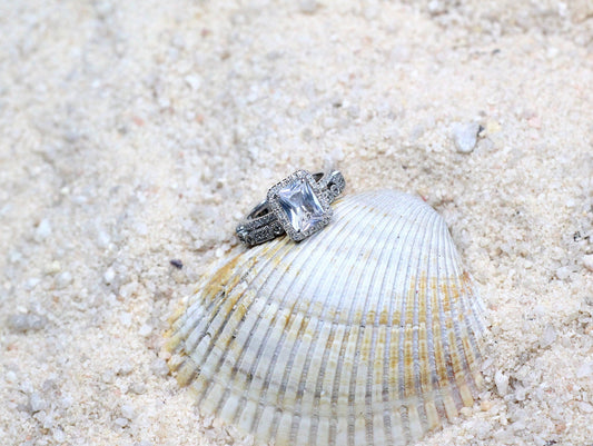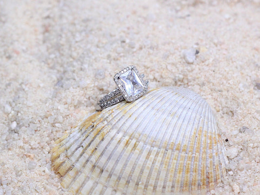 White Sapphire Engagement Ring Set, Wedding Band, Emerald Halo, Ione, 2ct, 8x6mm, gift for her, promise ring