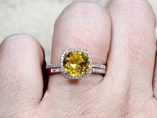 Yellow Sapphire & Diamonds Engagement Ring set, Diamond Wedding Band,Cuscino,2ct 8mm,Yellow Sapphire Ring,White Yellow Rose Gold,Gold Ring