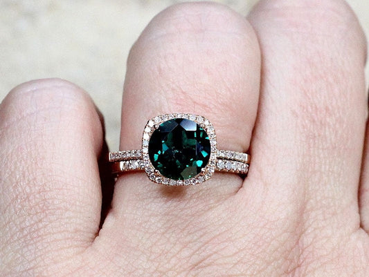 Emerald & Diamonds Engagement Ring Set, Cushion Halo, Wedding Band Set, Cuscino, 3ct, 8mm, Bridal Set, Promise Ring, Gift For Her