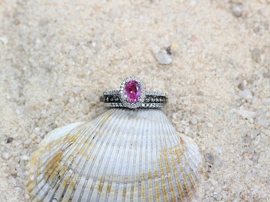 Pink Sapphire & Diamond Engagement Ring Eternity Bezel Wedding Band Set Ovale Ferarelle 1.5ct 8x6mm White-Yellow-Rose Gold-14k-18k-Platinum