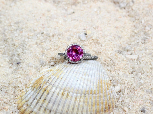 Pink Sapphire Enagagement Ring Set, Round Halo, Pave Band, Pricus, Elpis, 3ct, 9mm
