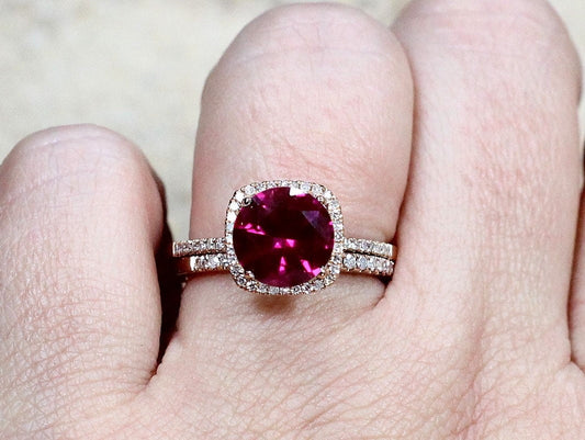 Ruby & Diamonds Engagement Ring set, Cushion Halo, Cuscino, Diamond wedding Band, 3ct, 8mm, Promise ring, gift for her