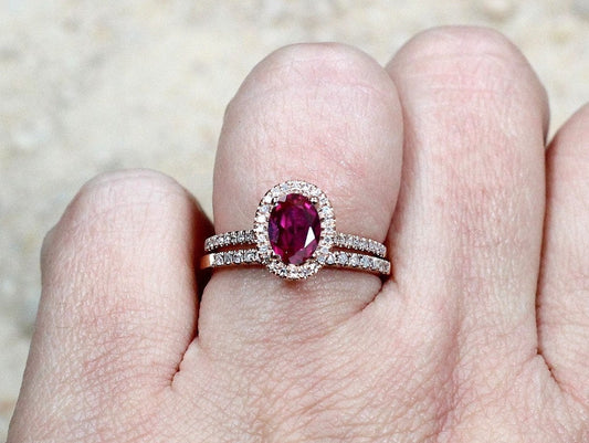 Ruby & Diamonds Oval Halo Engagement Ring wedding band Set Ovale Medio 2ct 8x6mm Custom White-Yellow-Rose Gold-10k-14k-18k-Plat