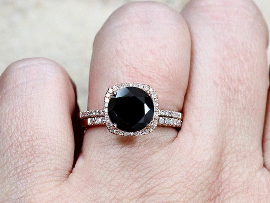 Black Spinel & Diamonds Engagement Ring Set Cushion Halo Cuscino Grand Wedding Band 2ct 8mm Custom White Yellow Rose Gold 14k 18k Platinum