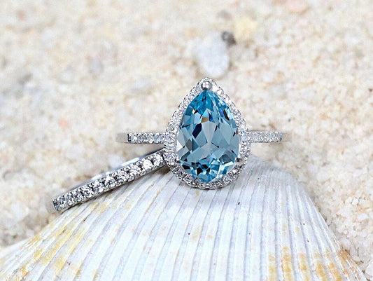 Light Blue Spinel Diamonds Engagement Ring Set,Pear Halo,Wedding Band Set,Goccia,2.5ct Ring,White-Yellow-Rose Gold-10k-14k-18k-Platinum