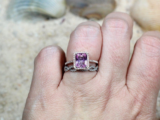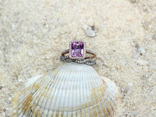 Pink Sapphire & Diamonds Halo Emerald Engagement Ring Wedding Band Set Hemera Infinite Love 2ct 8x6mm White-Yellow-Rose Gold-10k-14k-18k-Plt