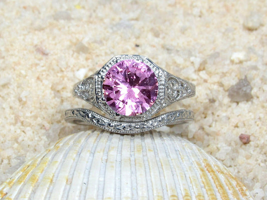 Pink Sapphire Engagement Ring,Sapphire Ring,White Sapphire Ring,Wedding Band Set,Vintage Ring,Antique Filigree Ring,Fides, 2ct 8mm