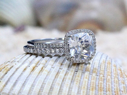 White Sapphire Engagement Ring Set, Cushion Halo ,Wedding Band Set, Cuscino, 3ct, 8mm, gift for her, promise ring