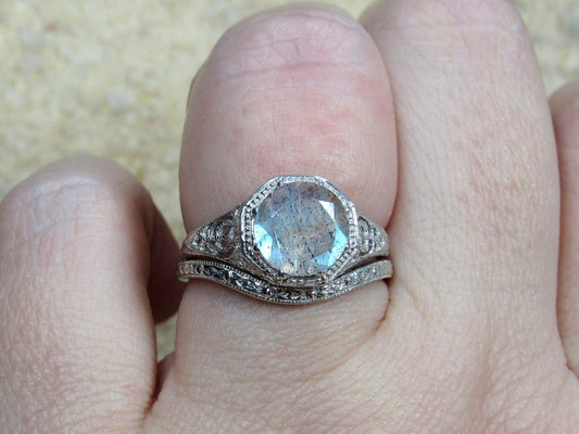 2ct Fides 8mm Labradorite Engagement Ring Set, Vintage, Antique, Filigree, Wedding Band Set