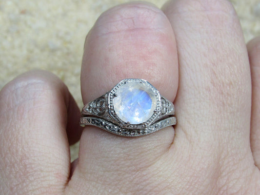 2ct Fides 8mm Moonstone Engagement Ring Set, Vintage, Antique, Filigree, Wedding Band Set