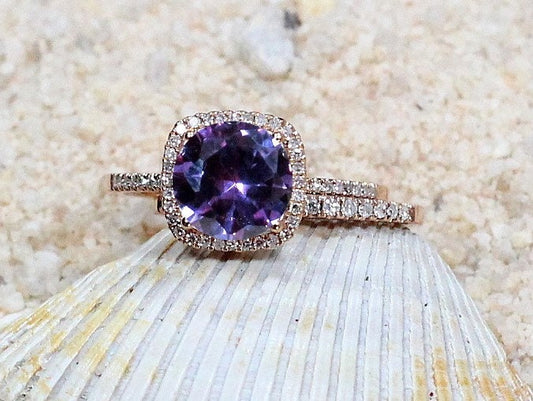 Color Change Sapphire & Diamond Engagement Ring Cushion Halo Wedding Band Set Cuscino 3ct 8mm Custom White-Yellow-Rose Gold-14k-18k-Platinum