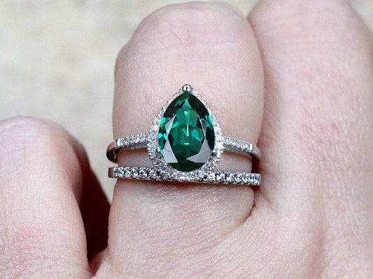 Emerald Diamonds Engagement Ring Set,Pear Halo,Wedding Band Set,Goccia,2.5ct Ring,White-Yellow-Rose Gold-10k-14k-18k-Platinum
