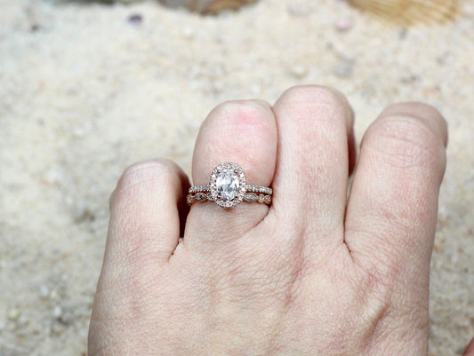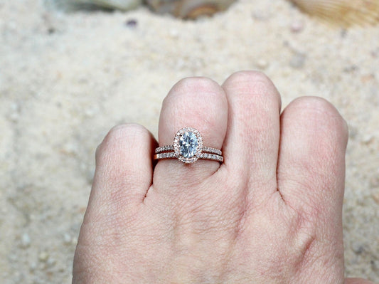 Moissanite & Diamonds Oval Halo Engagement Ring wedding band Set Ovale Petite .90 1ct 7x5mm Custom White-Yellow-Rose Gold-10k-14k-18k-Plat