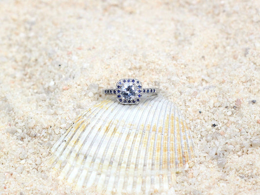 1ct Lab Created Diamond Ring, Blue Sapphire Ring, Cushion Halo, Milgrain Ring, 6mm Lab Grown Diamond Engagement Ring, Peitha