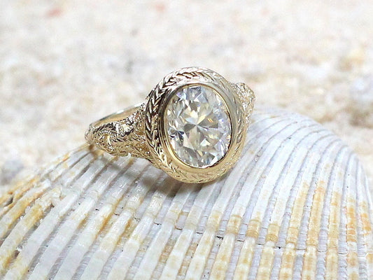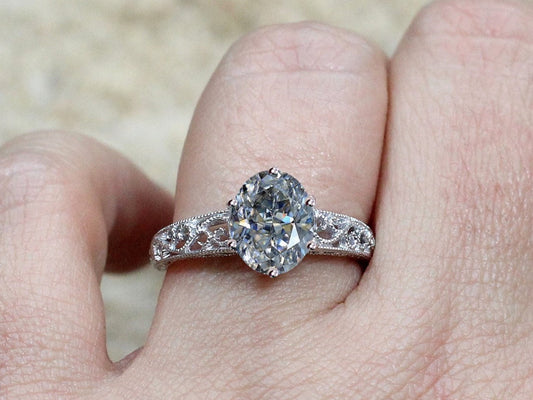 Vintage Moissanite Engagement Ring Polymnia Antique Milgrain Filigree Oval 2ct 9x7mm White-Yellow-Rose Gold-10k-14k-18k-Platinum