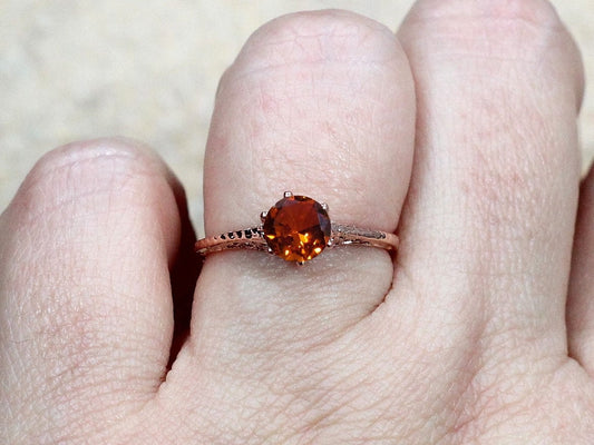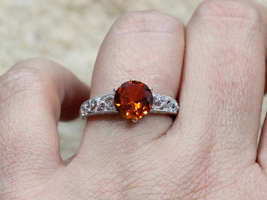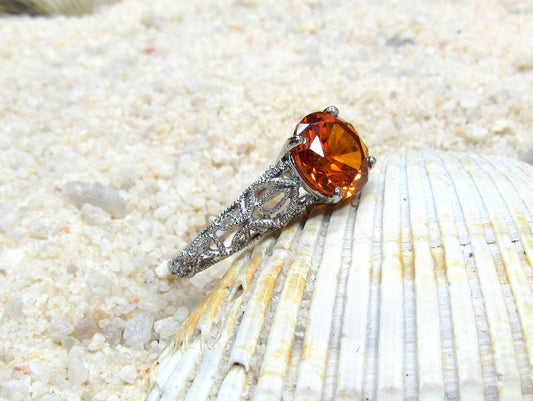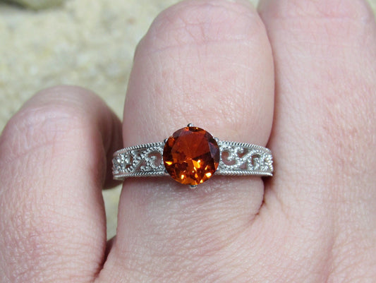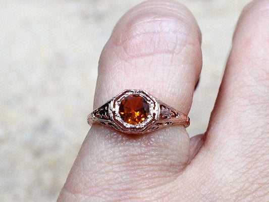 Orange Sapphire Engagement Ring, Vintage, Antique, Filigree, Round cut, Kassandra, .75ct, 5mm,Gift For Her,Gold-Plt