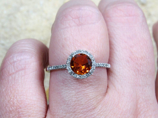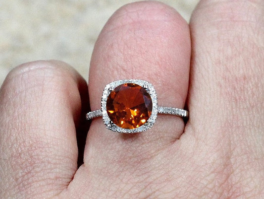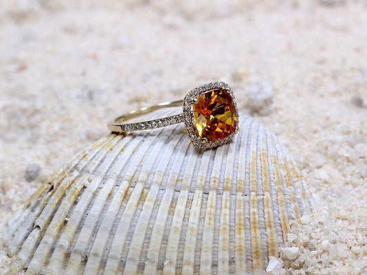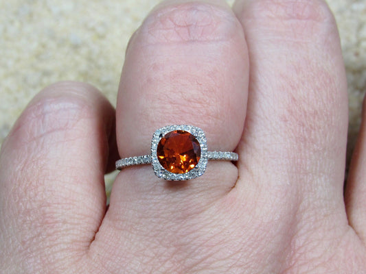 Orange Sapphire & Diamonds Engagement Ring Cushion Halo Cuscino Petite Round cut 1ct 6mm Custom White-Yellow-Rose Gold-10k-14k-18k-Platinum