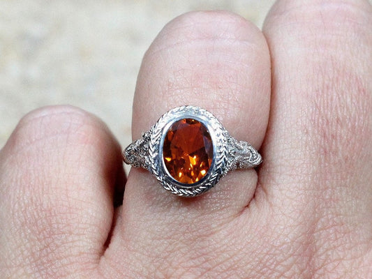 Vintage Orange Sapphire Engagement Ring Oval Antique Bezel Set Chevron Filigree Kore 3ct 9x7mm White-Yellow-Rose Gold-10k-14k-18k-Plt