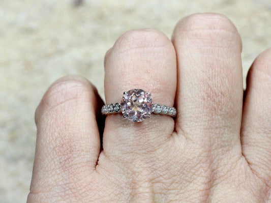 Peach White Sapphire Engagement Ring 3 Gem Stone Round Jubilee Grand 2ct 8mm 1ct 6mm Custom Size White-Yellow-Rose Gold-10k-14k-18k-Platinum