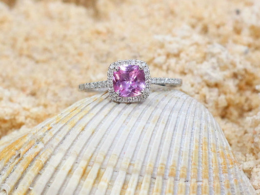 1ct Cuscino Petite 6mm Pink Sapphire Cushion Halo & Diamond Accent Engagement Ring