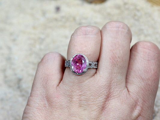 3.5ct 10x8mm Pink Sapphire Engagement Ring, Oval Halo, Infinity Band, XOXO