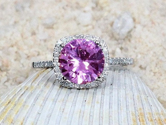 Pink Sapphire & Diamonds Cushion Halo Engagement Ring Cuscino Grand 3ct 8mm Custom Size White Yellow Rose Gold 10k 14k 18k Platinum