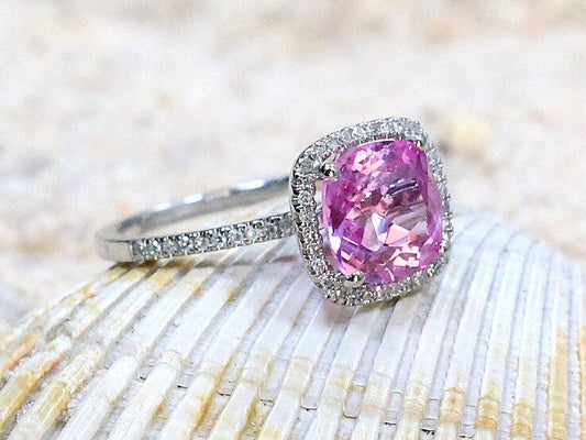 3ct Cuscino 8mm Pink Sapphire Diamond Cushion Halo Engagement Ring.
