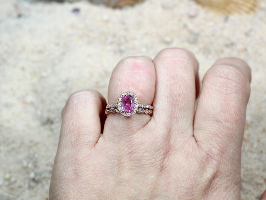 Pink Sapphire & Diamonds Engagement Ring Eternity leaf milgrain Wedding Band Set Ovale Aeolus 2ct 8x6mm White-Yellow-Rose Gold-14k-18k-Plat