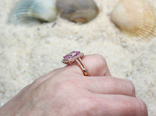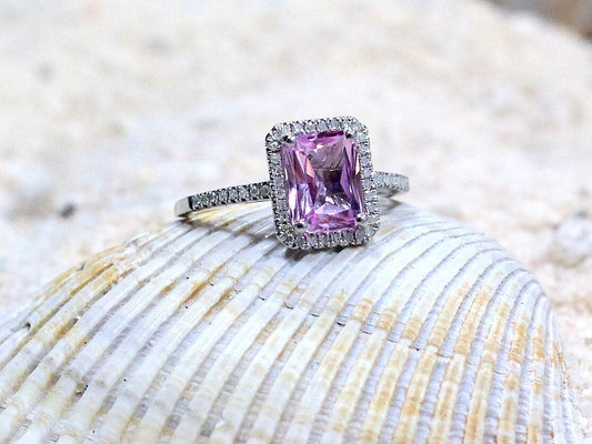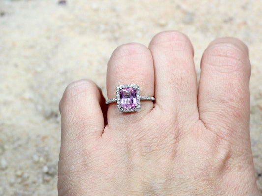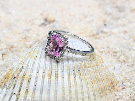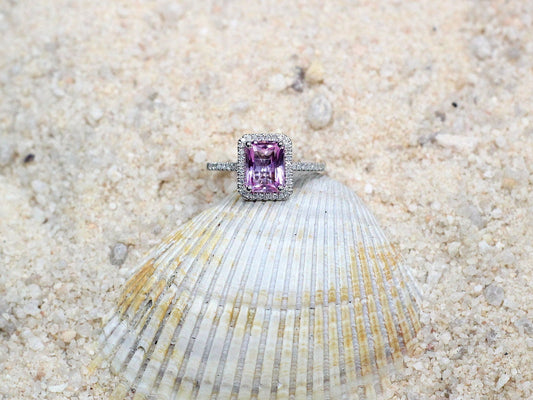 Pink Sapphire Engagement Ring,Emerald cut Halo,Ione, 2ct ,8x6mm, gift for her, promise ring