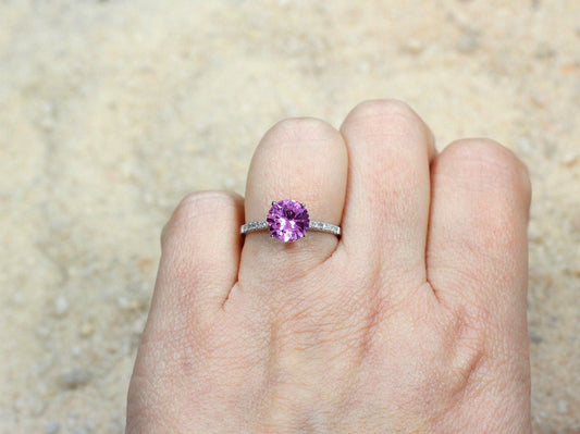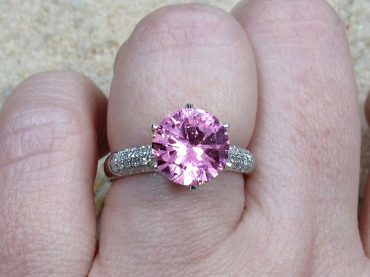 Pink Sapphire & Diamonds prongs Engagement Ring Crown Jewel Round High Profile 3ct 9mm Custom White-Yellow-Rose Gold-10k-14k-18k-Platinum